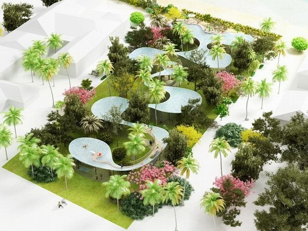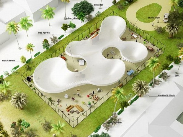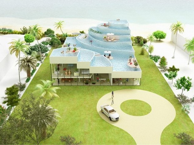 來自荷蘭的NLarchitects建筑事務(wù)所總能為我們帶來不一樣的新奇想法,很快他們設(shè)想了三個方案。都是將泳池架設(shè)在住宅的屋頂,房子的生活區(qū)位于泳池下面,以通透的玻璃幕墻圍合。通過泳池的不同形狀與深度劃分出下面的空間,上面的泳池儼然成為一個水上樂園!